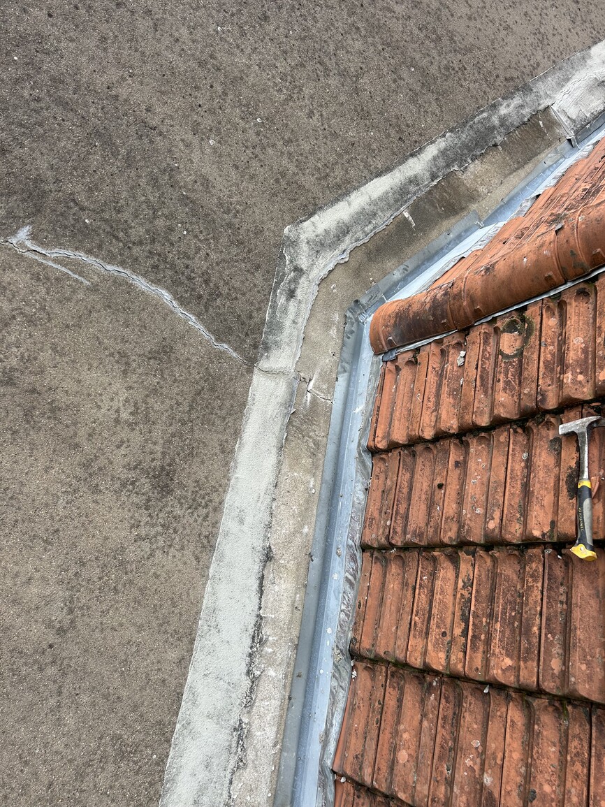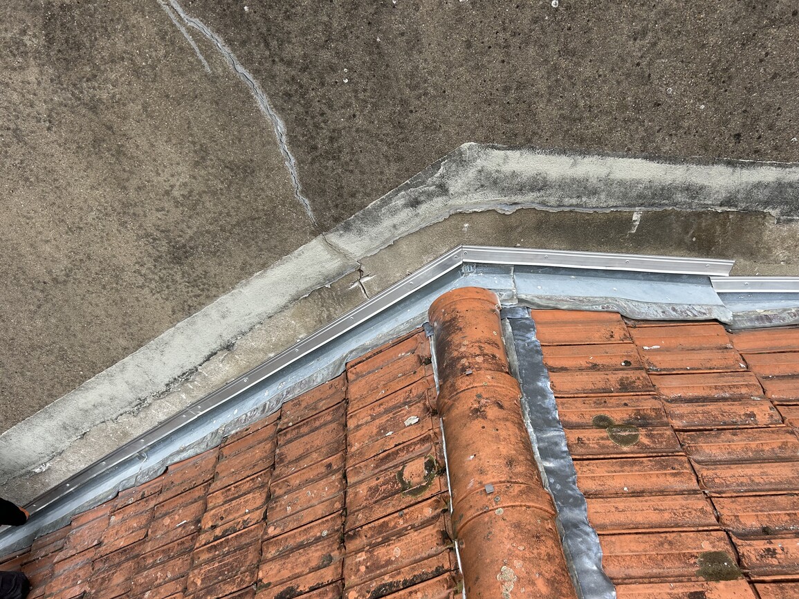 Réfection du faîtage avec mise en place d’une nouvelle bande de solin et fixation de protection.Avant / Après